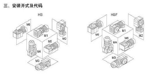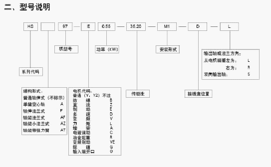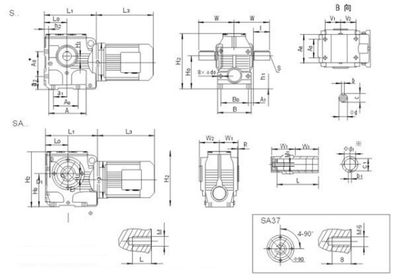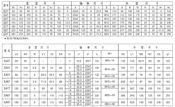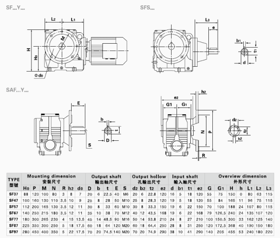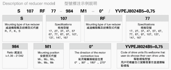 標記: S-軸伸式聯接 SA-軸裝式聯接 SF-軸伸式、法蘭安裝 SAF-軸裝式、法蘭安裝 D-表示軸輸入